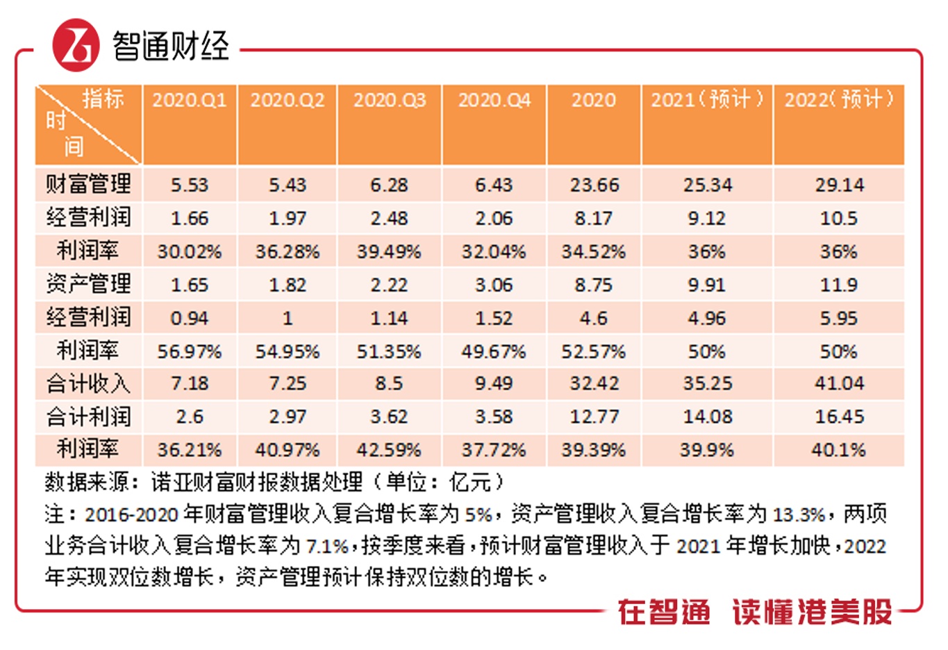 2021年行业发展乐观,按季度诺亚财富的财富管理及资管业务或将继续保持增长态势,2021年增长水平预计不低于近三年的复合增长水平,2022年整体进入双位数的增长通道。而在2020年四个季度,该公司财富管理及资管利润率区间相对稳定,经保守测算,2021年该公司将实现收入35.25亿元,经营利润14.08亿元。