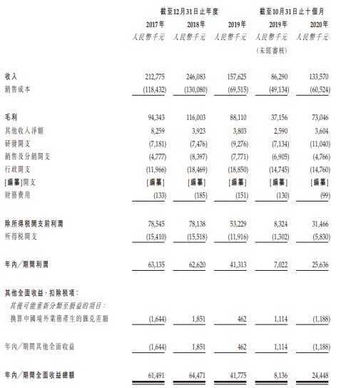 截至2017年、2018年及2019年12月31日止年度以及2020年首十个月,公司的总收入分别为约2.13亿元(人民币,下同)、2.46亿元、1.58亿元及1.34亿元。同期,公司的五大客户分别占总收入约36.4%、 41.6%、48.7%及38.9%,而最大客户分别占相关年度或期间的总收入约11.2%、 13.6%、16.4%及10.7%。