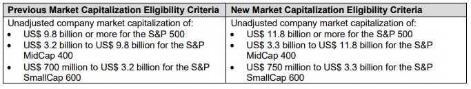 智通财经APP获悉,3月17日,标普道琼斯指数公布了标普500、标普400中盘股以及标普600小盘股指数最新的新增指标入选市值标准。其中,标普500指数将入选市值条件由98亿美元或以上上调至118亿美元;标普400中盘股入选市值条件更改为33亿美元至118亿美元;标普600小盘股入选市值条件更改为7.5亿美元至33亿美元,改动从3月17日起生效。