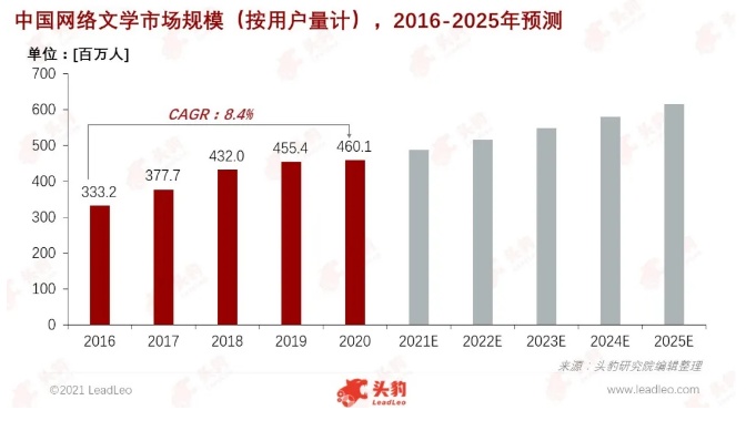 中国网络文学用户规模在2021年到2025年间将持续增长但增速将会放缓。增速放缓的主要原因有两个:(1)中国网民规模增长速度高于网络文学用户增长速度;(2)部分中国网民可通过视频或有声阅读等其他方式来进行文化的扩展,这些新兴方式可形成替代效应,压缩了中国网络文学市场的空间。