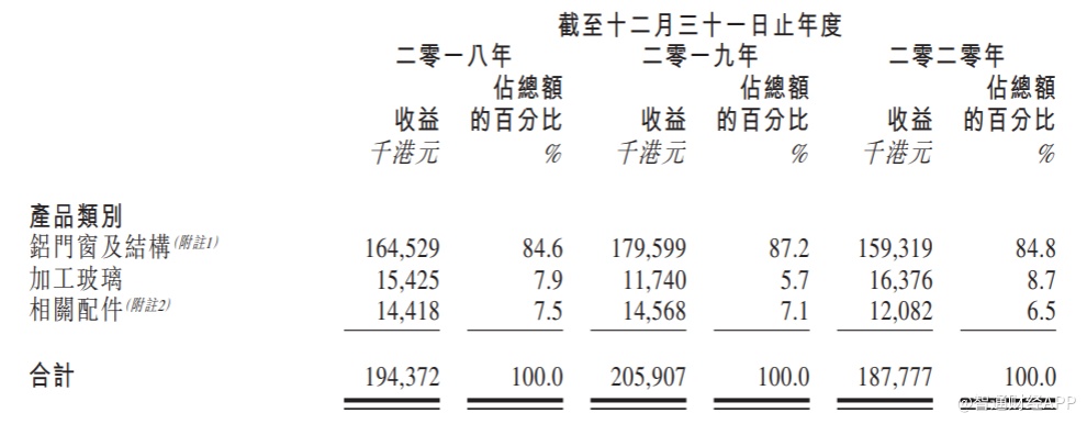 截至2020年12月31日止三個财政年度的期间,公司的销售额中逾80%来自于根据客户的规格及要求定制的铝门窗及结构产品的销售,而其余的销售额则来自于独立的加工玻璃产品及相关配件。公司产品可用于翻新及修葺香港的住宅物业及商业楼宇。