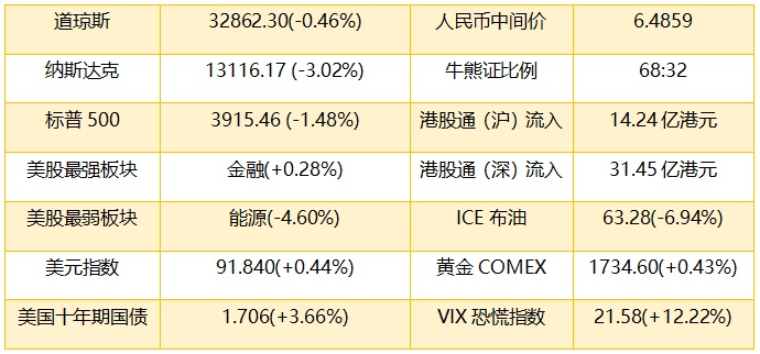 1、 美股收盘,道琼斯指数跌153.07点,跌幅0.46%,报32862.3点;标普500指数跌58.66点,跌幅1.48%,报3915.46点;纳斯达克综合指数跌409.03点,跌幅3.02%,报13116.17点。港股ADR指数收报29127点,跌277.54点或0.95%。
