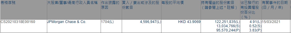 智通财经APP获悉,香港联交所最新资料显示,3月15日,JP Morgan&Chase Co减持李宁(02331)459.6947万股,每股作价43.9069港元,总金额约为2.02亿港元。减持后最新持股数目约为1.22亿股,最新持股比例为4.91%。