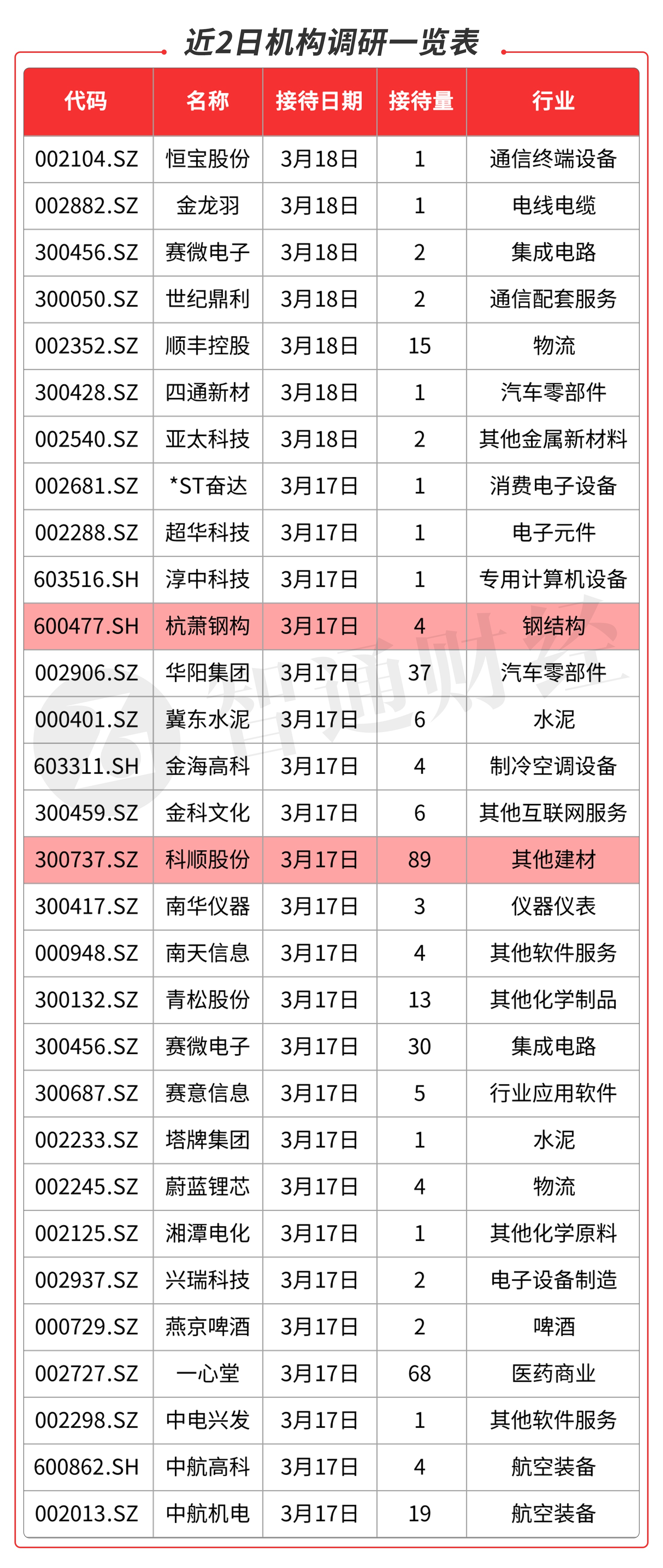 【导读】科顺股份(300737.SZ)和杭萧钢构(600477.SH)近期获多家机构调研。科顺股份(300737.SZ)系防水龙头企业,规模位居全国第二,整体收入体量与第三名以后企业拉开了差距。未来2-3 年该公司产能有望翻倍,增加直销客户覆盖率,且毛利率和净利率仍具较大改善空间。公司3月17日晚公司发布公告,拟通过发行股份及支付现金收购丰泽股份的100%股权,预估值和暂定交易作价为4.956亿元。杭萧钢构(600477.SH)是我国最早入选住宅产业化基地的钢结构企业,同时拥有总承包商一级资质。公司定增助力拓产能和智能制造,业务结构优化更专注主业。随着产业政策陆续出台和产品结构的不断完善,相信将会迎来新增长。