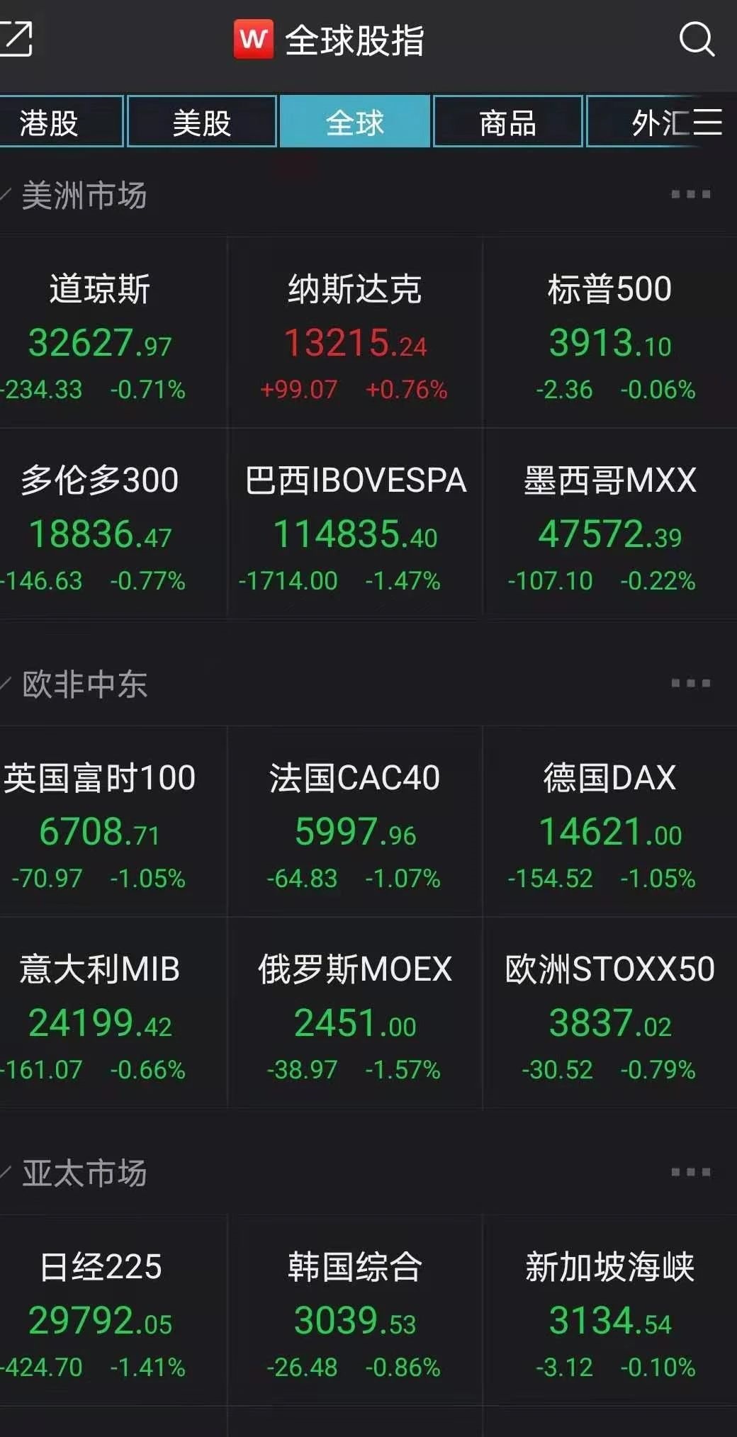 欧股全线收跌,德国DAX指数跌1.05%,法国CAC40指数跌1.07%,英国富时100指数跌1.05%。本周,欧股涨跌不一,德国DAX指数涨0.82%,法国CAC40指数跌0.8%,英国富时100指数跌0.78%。