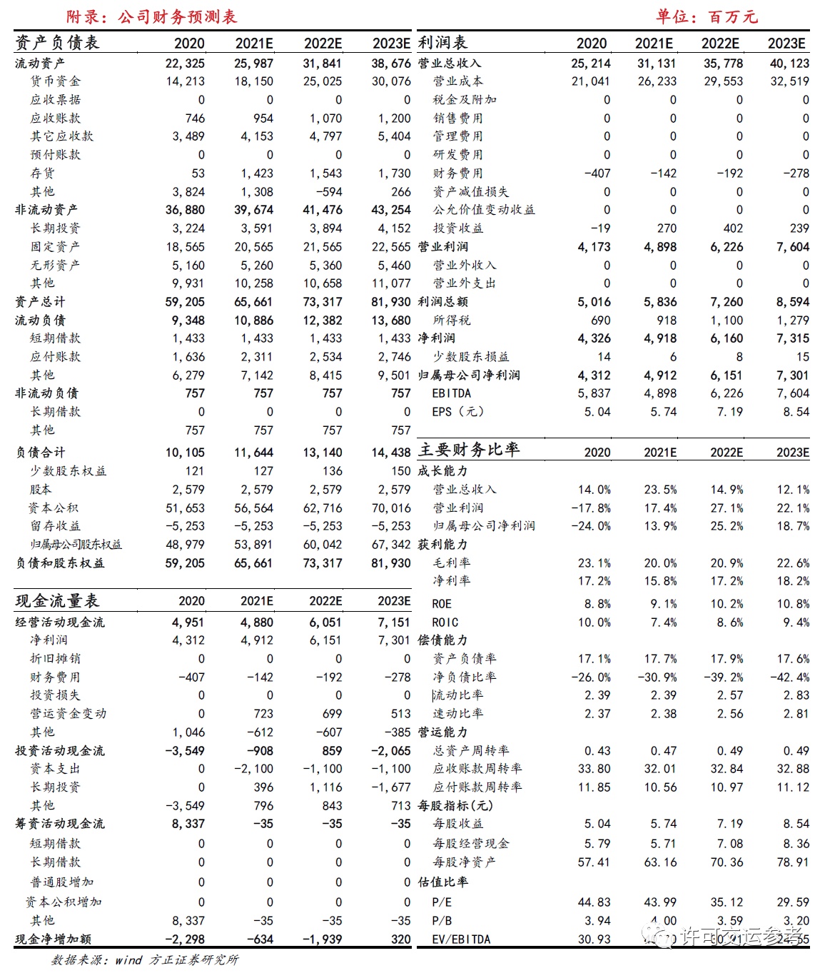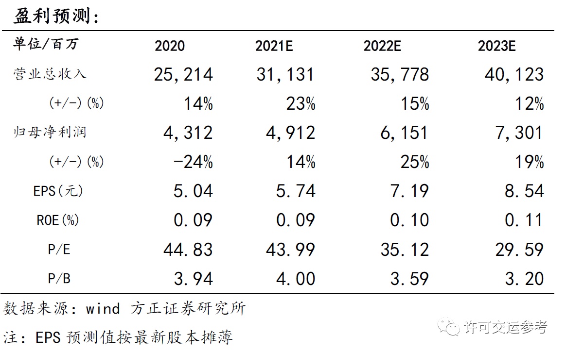 预计公司2021-2023年营业收入分别为311.31、357.78、401.23亿元,归母净利润分别为49.12、61.51、73.01亿元,对应2021、2022、2023年PE为43.99、35.12、29.59倍。维持“强烈推荐”评级。
