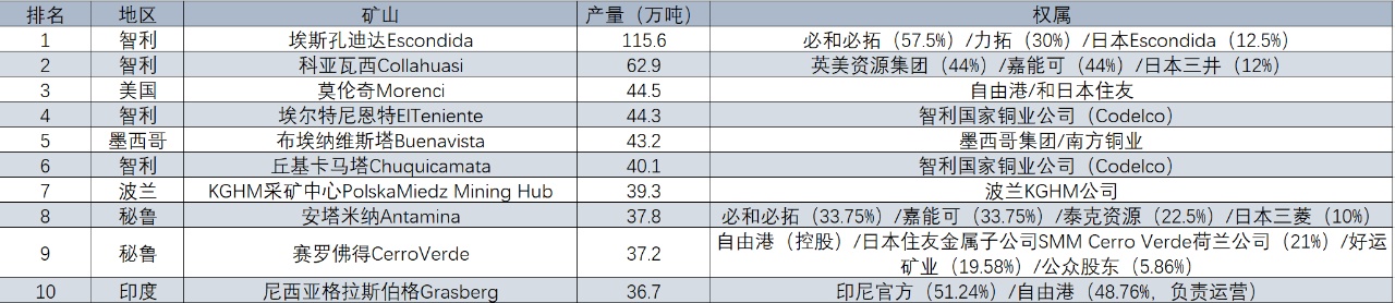 从矿山权益来看,全球十大铜矿主要被智利国家铜业公司、嘉能可、必和必拓、自由港、日本财阀垄断。