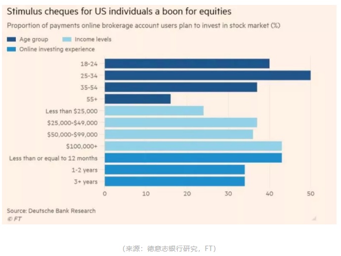 德意志银行(Deutsche Bank)对在线经纪账户用户的调查显示,他们计划将使用约37%的刺激资金投资于股市,这一数字随着年龄和收入水平的波动而波动。从下图可以看到这样一个现象:年轻人族群,以及高收入人群更愿意把这笔资金投入股市中。