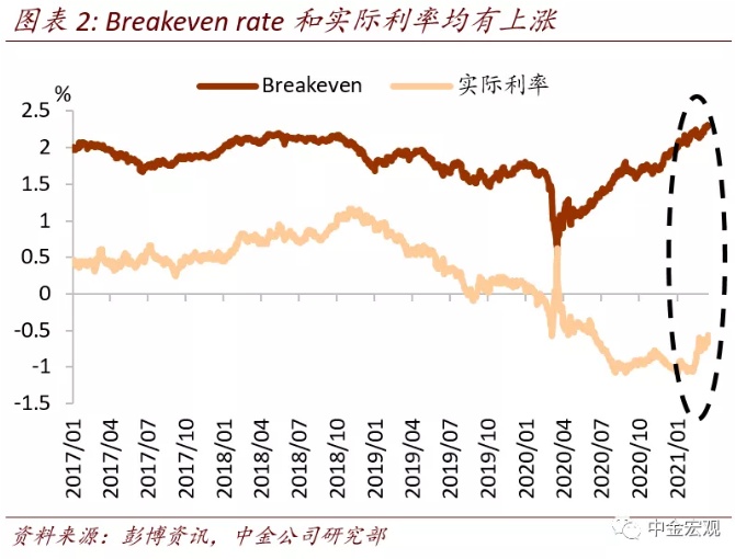 美债收益率上行所反映的宏观基本面仍未改变。一是对经济复苏信心在加强,2月以来实际利率已上升近50bp至-0.56%。二是通胀预期的升温,代表通胀预期的10年期Breakeven利率持续上行已达到2.3%(图表2)。3月FOMC会议上调了GDP增长与PCE通胀的预测,将4Q21的GDP增速预测从4.2%上调至6.5%,PCE通胀从1.8%上调至2.4%,核心PCE通胀从1.8%上调至2.2%。正如我们在《美联储欢迎通胀,加息不着急》的FOMC会议点评中所说,美联储货币政策声明措辞鸽派,而这一态度有望强化美国经济增长和通胀上行预期。即表态越鸽、压制短端利率,对未来预期越乐观,长债利率越涨;反之,短端利率若有上升压力,长端利率可能升幅就不大了。