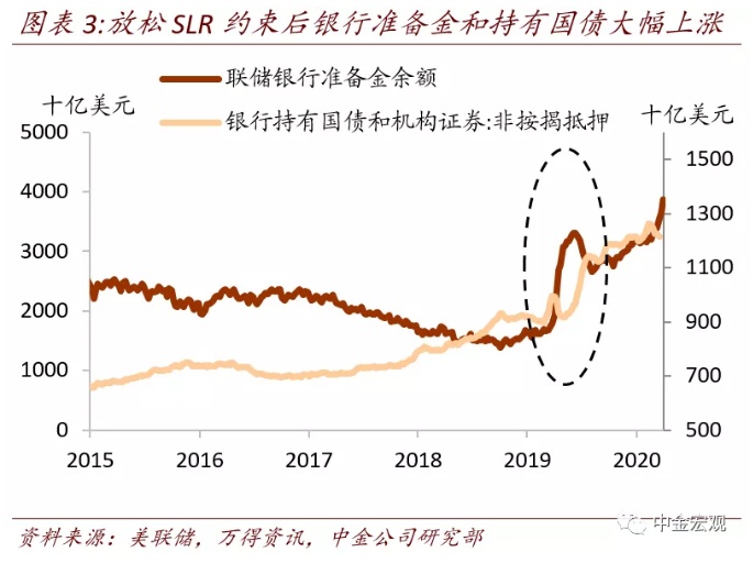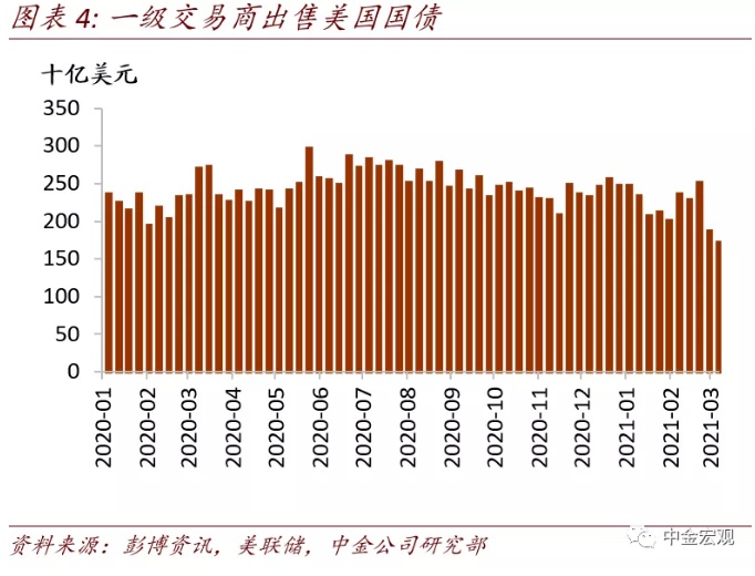 美债周四的波动受技术面因素影响更大。首先是FOMC会议上Powell拒绝对SLR豁免政策延期做表态。SLR是金融危机后美联储用来监管商业银行的资本充足率指标之一,计算公式为一级资本除以总风险敞口(包括国债与准备金),一般要求不低于3%-5%。疫情发生后,美联储无限量宽后商业银行被迫扩表,银行持有国债和准备金快速上升,导致很多银行资本充足率低于要求而不达标,阻碍无限量宽的推行。因此美联储、联邦存款保险公司(FDIC)、通货监理署(OCC)于2020年4月1日联合修改规定放松SLR约束,允许在计算SLR时不把国债和准备金计入分母,有效期至2021年3月31日。此后,联储银行准备金从2020年3月25日的2.35万亿美元快速上升,截至2021年3月10日已经上升至3.65万亿美元;商业银行持有国债和机构债券中非抵押按揭部分从3月25日的0.93万亿美元上升至3月3日的1.21万亿美元。如果该项政策不延期,一些银行可能为了满足资本充足率而抛售国债。过去半个月一级交易商已经减持美国国债807亿美元,其持有额从2月24日的2505亿美元下降至3月10日的1698亿美元(图表4)。