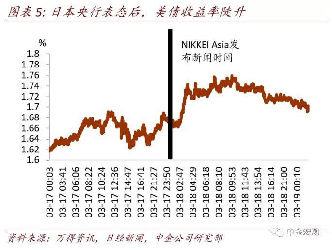 从此次国债收益率大涨的时间点上看,日本央行表态或许也有影响。日本产经新闻于东京时间3月18日中午发布新闻称日本央行表态取消6万亿日元ETF购买目标,以及将10年期日本国债收益率控制区间由0扩大至+/-25基点,使得YCC(收益率曲线控制)更加灵活。该消息发布后不久美国十年期国债收益率迅速从1.66上行至1.74(图表5)。这可能是因为市场将日本央行的表态解读为其将逐渐退出宽松,而日本债市午盘休市,由于发达国家流动性有联动性,抛压反映在了美国国债上。