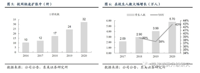 全国已有32所学校,在校生人数大幅增长已达到5万+,异地扩张已初具规模。近年来公司保持了高速扩张的态势,K12学段学校数从2017年12 所增加到2020年的32所,18-20年每年分别增加了5所/7所/8所,校网已经遍布了全国8个省份,20个城市,共有在校生人数5.7万人,同比增速42.8%。2021年公司将继续保持较高的新建学校速度,目前公司已敲定的未来年度新建学校计划达13所。