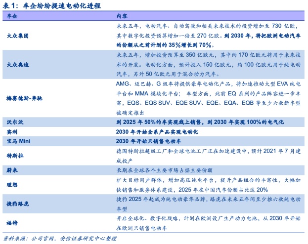 在上周的周报《短期看产销喜人排产旺,长期看电动化之势正燎原》中,我们已经提到,从长期来看,电动化+数字化趋势明确,各大车企纷纷加码布局,群雄逐鹿局面正加速形成。在全球碳中和的步伐驱动下,传统车企方面,除大众的MEB平台和对数字化的投入和规划外,目前,包括奔驰、奥迪、沃尔沃等车企纷纷加大投资规划,加速自身在平台化车型的开拓和对于数字化的探索;此外,包括宝马Mini、福特、宾利、捷豹和沃尔沃等车企也纷纷提出电动化时间表;而从电动化车企和新势力来看,特斯拉持续推进电动车与动力产能建设,以蔚来、理想和小鹏为代表的中国造车新势力也在纷纷提出其未来五年发展战略。与此同时,包括苹果、小米等科技巨头也纷纷加入战局,随着各大车企对新能源车产能的加大投入及新车型的持续研发,未来新能源车无论是车型数量还是销量均将进入快速增长期。