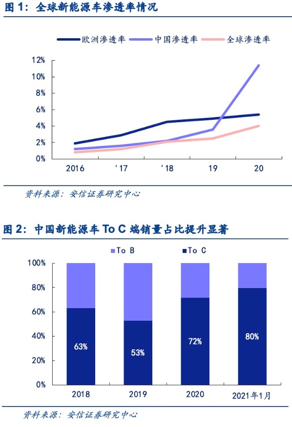目前政策+产品双擎驱动,电动化已进入快速发展阶段。政策方面,中国区别于往年,补贴退坡已提前确定,不会对季度销量造成影响,同时,商务部持续发文,鼓励各地通过补贴等方式促进农村和城市的新能源车消费。欧洲的核心政策碳排放目标持续加码,目前各国补贴政策总体并无显著退坡。美国则计划通过补贴和政府采购等方式推动新能源车销量增长。从发展阶段来看,全球新能源车渗透率在2020年有了明显的跃迁,达到4%,同比增1.5Pcts;而在部分区域市场如中国,我们看到在产品驱动的效应下,To C的销量占比提升显著。目前在政策+产品的双擎驱动下,我们认为电动化已进入快速发展阶段