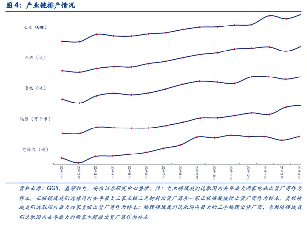 而在排产方面,产业继续呈现高景气态势。从目前的排产情况来看,目前动力电池产业链各领域行业高景气态势延续,尽管在2月由于春节假期方面的原因,产量环比有所下降,但三月份维持高景气态势,随着下游整车厂尤其是新能源车厂需求持续高涨,电池产业链维持高景气态势。