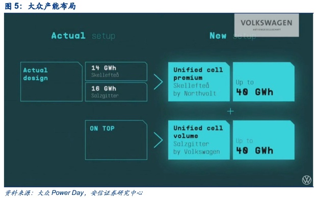 大众将持续完善电池产能布局,2030年将达240GWh。据介绍,到2030年纯电动车型将占大众集团全部新车的60%,按照这个比例大众需要240 GWh电池产能。为了满足未来电动车的生产销售需求,大众将通过独资或者合资在全球部署建设6家自有电池工厂,平均每家目标产能40GWh。首家合作是在瑞典与Northvolt的合作,预计在2023年落成,其次是自建的萨尔茨吉特一体式电芯工厂,未来还规划在东欧的西班牙或法国,西欧的波兰捷克落子,以此实现自产自销的高效生产能力,预计到2030年大众外购电芯比例约20%(注:这里的外购是指独资和合资电芯产能采购之外的采购)。