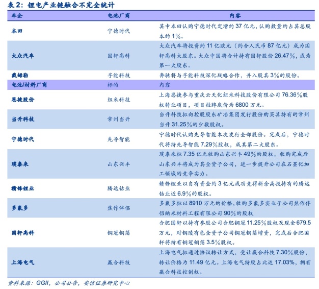 锂电产业链融合加速,厂商之间紧密绑定,具有全球竞争力的电池和材料厂商更具优势。实际上,车企布局电池产能已成为趋势,这在另一层面预示着锂电产业链融合正在加速,在未来,厂商之间的紧密绑定趋势将更为明显。在此前的周报《珠联璧合进行时——领先车企入股电池厂商深层次解析》中,我们已提到,2020年以来,锂电产业链的融合持续加速。其中,车企与电池厂商的融合加速,车企入股电池厂商成为新的趋势。与此同时,头部电池和材料厂商或横向或纵向加速布局产业链,一方面能够有效降低成本,另一方面也为上游原材料的供应提供坚实保障。随着厂商之间的紧密绑定,未来产业集中度将持续提升。