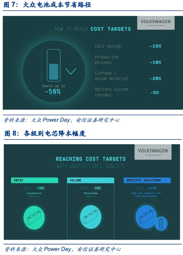大众宣布2023年将量产标准电芯,电池成本最高降低50%。在电芯层面,与之前的特斯拉电池日一样,大众也针对电芯方案提出了一系列降本措施和实现路径。大众提出了打造标准电芯(Unified Cell)的概念,从目前来看,选择的是方形电池的路线。且根据车型定位不同,为标准化电芯设计了磷酸铁锂、三元、高锰电池、固态电池共四种材料方案。标准化电芯将会覆盖大众旗下80%车型,另外20%将会使用独立的专用电池设计。从电池降本方面来看,整体的成本下降路径涵盖电芯设计降本15%、生产流程降本10%、正负极材料降本20%、系统设计降本5%;大众将电芯分为入门、主流、定制三个级别,其中入门产品搭配低端材料(如磷酸铁锂),电池成本最多可降低 50%,主流电池产品搭配主流材料(如三元锂电池),电池成本可降低 30%,而定制型由于采用高性能电池所以成本略有上浮。