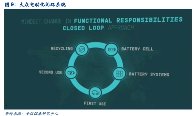 大众power day提出要打造独有电池化闭环系统。发布会上大众提出将打造电动化商业闭环,除电芯以外,还包括电池系统、一手使用(车辆)、二手使用(储能)以及电池回收;通过各环节之间的协同效应来打造完整的电池生态链。