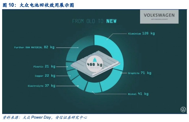 4)全生态布局之路开启,新能源车相关配套产业也值得关注。发布会上大众还提出将打造电动化商业闭环,除电芯以外,还包括电池系统、一手使用(车辆)、二手使用(储能)以及电池回收;通过各环节之间的协同效应来打造完整的电池生态链,此外,大众还在中欧美三地皆对充电基础设施建设进行布局。随着新能源车保有量快速增加,包括电池回收,充电基础设施等相关配套产业也值得关注,目前在全球范围内,包括大众和特斯拉领衔的车企已在充电桩布局方面加速规划建设,电动车全生态布局之路已开启。