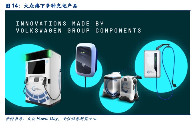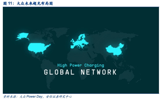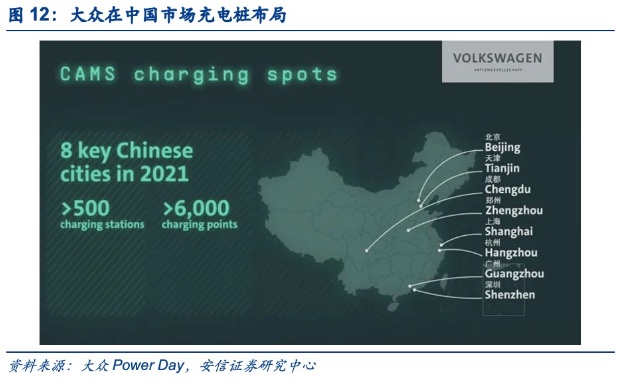 1)中国市场:就目前中国的充电设备仍存在充电耗时长和充电桩数量不足的短板问题,大众为解决这一难题,完善充电网络,预计2021年通过大众与一汽、江淮和星星充电组建成立的CAMS合资公司,在中国8个城市投入建设600个充电站、5000根充电桩,并预计2025年将达到1.7万根充电桩的规模,届时落成的超级充电站的充电功率将从120kW起步,另外有180kW,甚至300kW。