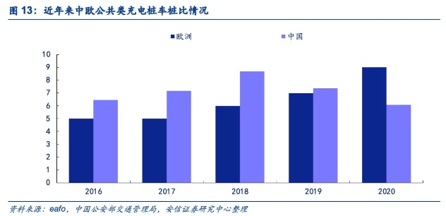 车桩比仍处于低位,相关配套产业也值得关注。从近年来中国和欧洲地区公共类充电桩车桩比来看,2020年末,欧洲车桩比为9:1,较2019年大幅提升,在2020年欧洲新能源车销量高速增长的前提下,相关的充电基础设施建设并未及时跟上;而从中国来看,尽管车桩比相较于2019年有所降低,但仍超6:1,若假设私人桩数量与公共桩数量基本相同,在此基础上,无论是中国还是欧洲的车桩比仍显著低于预期规划水平,目前在全球范围内,包括大众和特斯拉领衔的车企已在充电桩布局方面加速规划建设,随着新能源车保有量进一步增加,相关配套产业也值得关注。