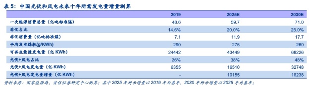 国内新能源渗透率尚低,成长空间广阔。我们假设非化石能源占比在未来十年持续提升,在2025年和2030年持续提升至20%和25%,在平均发电煤耗逐年下降,光伏+风电发电量占比逐年提升的基础上,我们分别以2019年和2025年为基年,预计2025年和2030年所需光伏+风电发电量增量分别达1.06万亿KWh和1.62万亿KWh。
