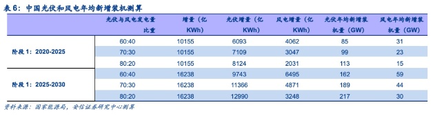 中国光伏在未来五年年均新增装机预计在85-113GW,根据预计发电量增量,在现有的风电和光伏装机的基础上,预计2020-2025年光伏和风电年均新增装机量在85-113GW和15-31GW的范围内,2025-2030年光伏和风电年均新增装机量在162-217GW和30-59GW的范围内。