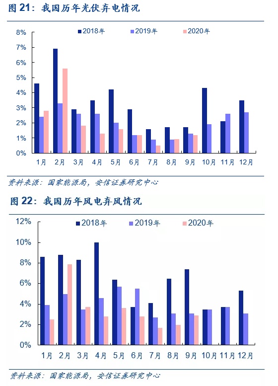 平价时代消纳问题成为硬约束。我国太阳能和风能资源丰富程度在空间上呈现为由西北向东南递减,而主要负荷则集中在东南沿海地区。电力负荷无法满足太阳能和风能出力会出现弃光和弃风问题,此外新能源渗透率过高会造成电网运行的不稳定,也是制约光伏和风电装机增长的一大因素。由于2018年“531”暂停新增装机以及特高压线路接连投运,2019年国内弃光率下降至为2%,相比2018年的3%下降1pct,已经有了大幅改善,目前弃光严重的地区主要是西北的西藏、新疆和青海。
