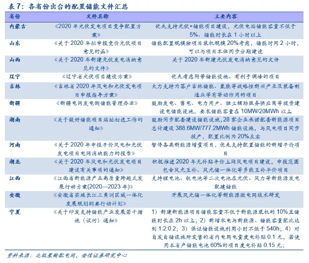政策频出,缺乏盈利模式是新能源电站配套储能的痛点。国家层面,2021年2月,国家发改委和国家能源局发布《关于推进电力源网荷储一体化和多能互补发展的指导意见》,文件指出,利用存量常规电源合理配置储能,积极实施存量“风光水火储一体化”提升,稳妥推进增量“风光水(储)一体化”,探索增量“风光储一体化”,严控增量“风光火(储)一体化”;2020年5月19日,国家能源局发布《关于建立健全清洁能源消纳长效机制的指导意见(征求意见稿)》,提出鼓励推动电储能建设和参与,以此促进清洁能源高质量发展。地方层面,截止目前11个省份陆续出台了鼓励新能源电站配套储能的文件,其中湖南、山西等省份建议风电、光伏等新能源发电配置20%储能。由于电力市场制度的不完善,用户侧配置储能的自发性不强,因此当前储能的配置主要集中在发电侧。然而,由于目前发电侧储能不参与电网调度,盈利模式不清晰,因此配套储能的成本基本由电站业主方承担,盈利模式的缺乏和高昂的储能成本成为解决消纳问题的痛点。