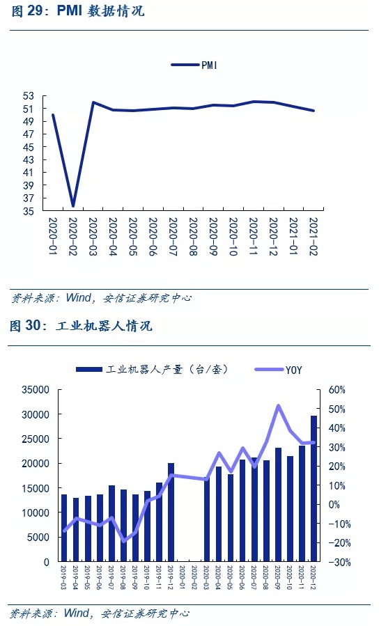 工控方面,制造业景气度持续上升。进入2021年,尽管考虑到去年2月的疫情影响,但2021年前两月制造业景气度仍处于上行阶段,2月规模以上工业增加值累计同比上升35%;延续了去年下半年以来的良好势头。2021年2月份, PMI指数为50.6,继续位于荣枯线之上,制造业景气度持续上升。而从工业机器人产量来看,随着上半年疫情后国内中小企业复工达产,4-12月工业机器人产量同比增长27%/17%/29%/19%/33%/51%/39%/32%/32%(1-2月同比下降19.4%),工控行业景气度持续提升。