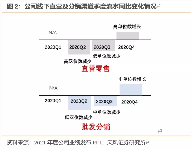 公司总体同店销售增加中单位数,20Q2~Q4线下同店销售呈现中单位数减少,直销和批发渠道同比减少中单位数;线上的同店同比为30~35%低段增长,2020H2以来整体同店销售明显回升。