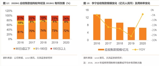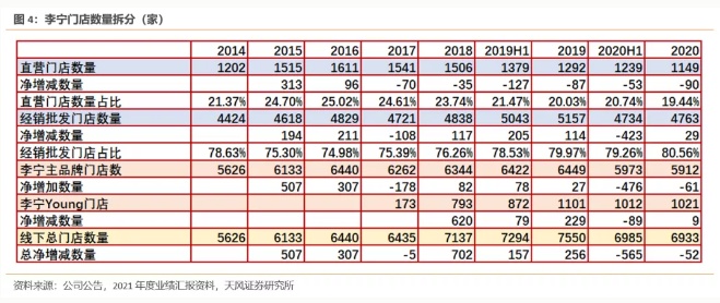 1)李宁核心品牌(除李宁YOUNG外):公司加速推进渠道多元化发展,聚焦门店质量提升,同时受到2020H1新冠疫情影响,公司持续主动加速关闭亏损和低效店铺,优化渠道结构,线下门店数量整体所有精简至5912家(-8.33%),较2019年底净减537家。
