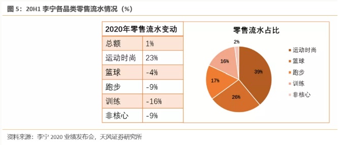 2)篮球品类2020年零售流水同比下降4%,目前流水占比为26%。① 产品端,公司聚焦篮球文化与科技创新,树立潮流形象与专业地位;② 营销端,通过签约NBA球星,推出CBA城市限定款等强化品牌专业篮球形象。
