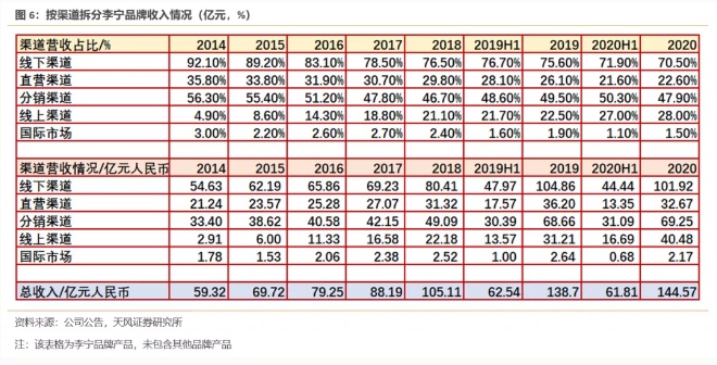 电商渠道维持高增速,在过去几年销售收入上升30%,营收占比升至29%,而2019年占比为24%;