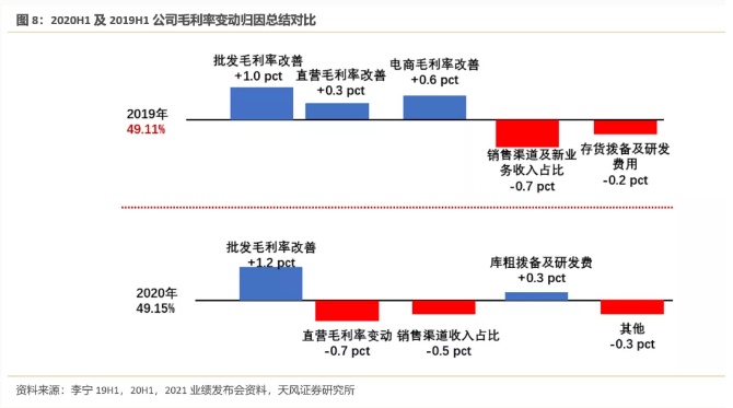 2020公司主营业务毛利率49.15%,同比增长0.04pct,基本持平,其中批发毛利率改善对整体毛利率稳定起主导作用(贡献1.2pct毛利率增长),同时公司库存拨备及研发费用缩减对毛利率持稳贡献了0.3pct正向增长。