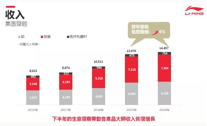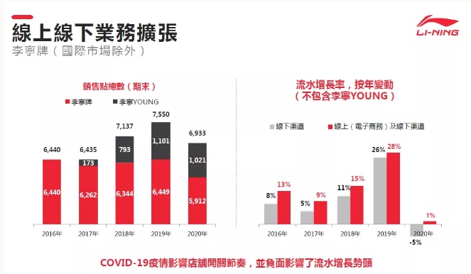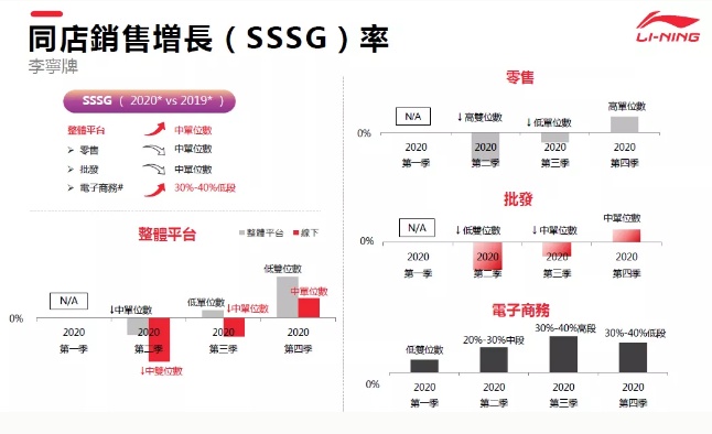 在销售表现方面,确定五大核心品类的全平台零售流水由2020上半年的下跌11%恢复至全年度的正增长。2020下半年度的零售流水明显稳步回升,其中运动时尚品类在疫情下表现表现出较强的韧性,全年度零售流水增长23%。跑步及训练品类由于较强的功能属性,受疫情影响较大,但与2020上半年相比,2020下半年仍有明显的恢复趋势,疫情发展开始明朗,内需市场陆续恢复。我们对李宁品牌的长期发展是充满了信心。
