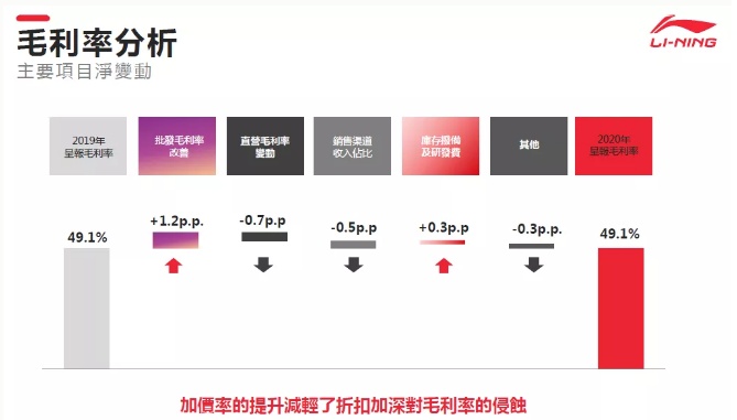 电商业务:是2020年重要业务支持。明确李宁大电商的业务战略,围绕渠道、商品、价格、营销、会员服务这几项重要生意维度进行全链路打通,强化线上线下业务整合协同。在过去一年,我们通过每一周的电商业务的跟进会议,去跟进业务进展,建立电商与线下业务的跨职能沟通协同。此外进行电商渠道整合,不断地规范线上渠道的经营秩序。
