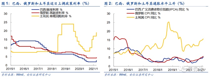 近日,巴西等新兴市场三国央行相继加息。巴西央行17日宣布,将基准利率从2%上调至2.75%。这是巴西央行自2015年7月以来首次加息。土耳其央行18日将基准利率自17%提高至19%,2020年9月以来,土耳其政策利率已经累计上调875BP。俄罗斯央行19日宣布,将基准利率提高0.25个百分点至4.5%,这是俄罗斯央行2018年12月以来首次加息。