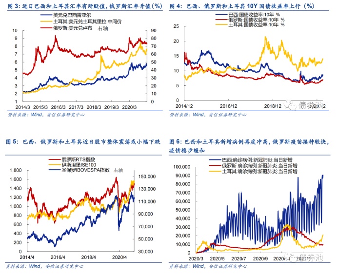 从三国汇率和资本市场来看,汇率或也是巴西和土耳其央行加息的原因之一,加息存在未雨绸缪防范资本外流风险的意味。巴西和土耳其汇率近日出现了一定程度的贬值,而俄罗斯由于疫苗接种相对较快以及油价上涨,汇率有所升值。从三国资本市场来看,股债均未出现大幅度的下跌,尚未出现大规模的资本外流。