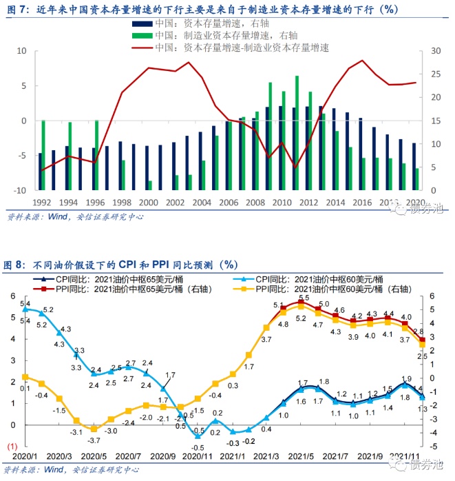 首先,虽然海外通胀预期会对国内物价产生一定的外溢效应,但考虑到国内资本存量增速的下降主要来自于制造业资本存量增速的下降,因此,输入性通胀对国内PPI的传导可能会比较高效,但预计对CPI的影响相对较低。同时考虑到基数等原因,预计PPI下半年趋于下行。因此,输入性通胀导致国内货币政策方向性收紧的概率较低。