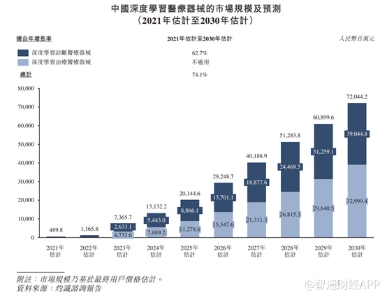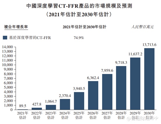 根据灼识咨询的资料,预计中国深度学习CT-FFR产品的市场规将从2021年的人民币89.5百万元增长至2030年的人民币137亿元,复合年增长率为74.9%。