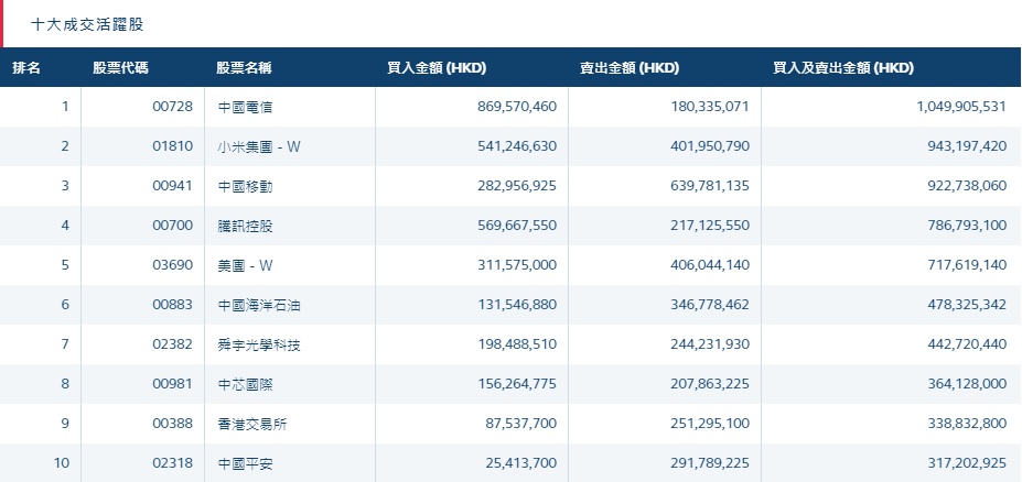 中国电信(00728)获净买入6.89亿港元。消息面上,中国电信此前发布回归A股相关公告,并将于4月9召开特别股东大会,对相关议案进行审议。公司近日首次透露了A股发行的募资计划,三大募投项目未来三年总投资规模合计1021亿元,初步利用募集资金投资额合计544亿元。值得注意的是,同属电信股的中国移动(00941)今日遭净卖出3.56亿港元。