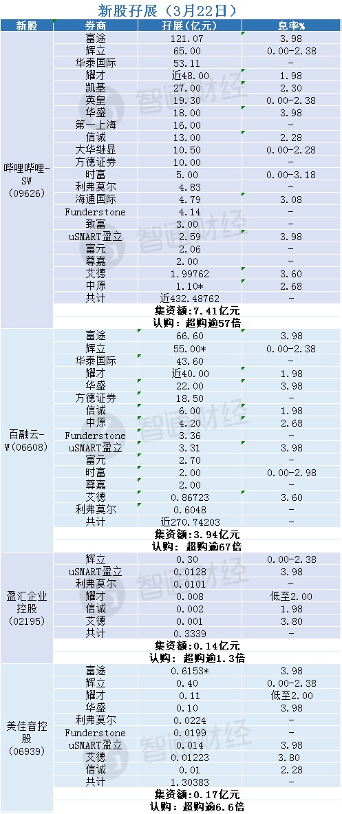 智通财经APP获悉,哔哩哔哩(09626)、百融云(06608)、盈汇企业控股(02195)、美佳音控股(06939)正在招股中。截至3月22日,辉立、耀才等分别合计为其借出近432.48762亿港元、近270.74203亿港元、0.3339亿港元、1.30383亿港元,分别超额认购逾57倍、67倍、1.3倍、6.6倍。