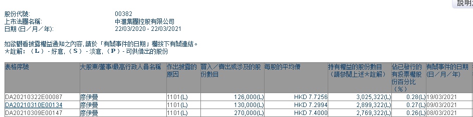 公开资料显示,3月8日,廖伊曼女士增持中汇集团27万股,每股均价7.4港元,总金额为199.8万港元;3月9日,廖伊曼女士增持公司13万股,每股均价7.2994港元,总金额约为94.9万港元;3月19日,廖伊曼女士继续增持公司12.6万股,每股均价7.7256港元,总金额约为97.3万港元。