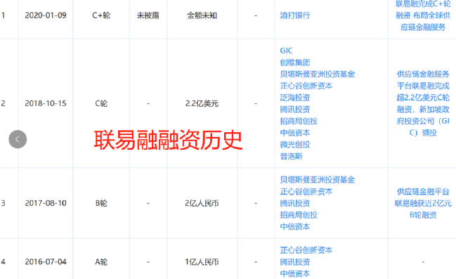 根据公开信息,公司股东及投资方包括腾讯、中信资本、正心谷、贝塔斯曼(BAI)、渣打银行等。2016年8月、2017年8月、2018年10月,联易融分别完成一轮融资,融资额分别为1亿元、2亿元、2亿美元,腾讯(00700)为第一大外部股东,持股占比18.89%。