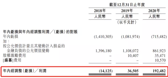 2018~2020年度,公司亏损额分别为14.1亿、10.8亿、7.15亿,三年累计净亏损额约32亿元人民币。同期经调整近三年盈利分别为-1412.5万、3650.5万、1.92亿。