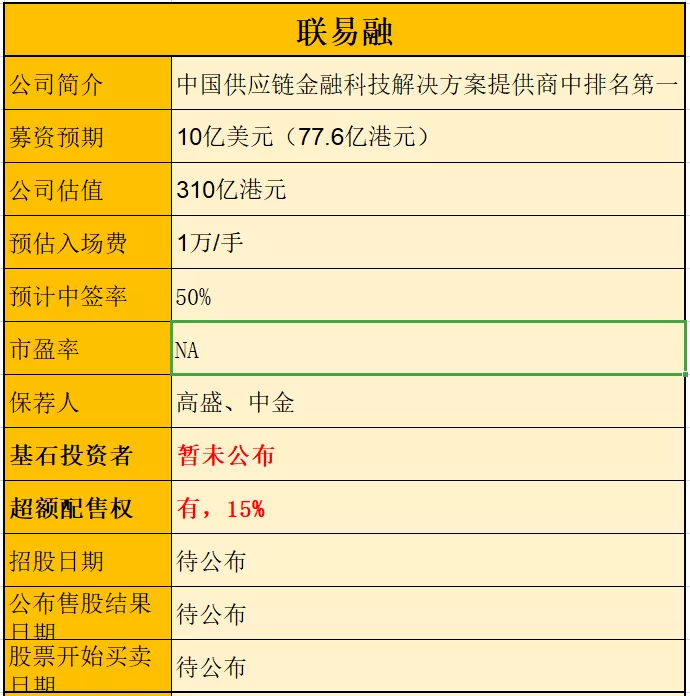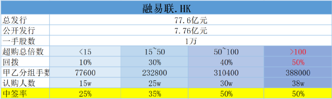 据传公司总募资金额10亿美元即77.6亿港元,公开募资金额7.76亿元。我们按照单手一万元计,甲乙组初始手数为7.76万手,预计倍数落在>100倍,回拨5成后,共计38.8万手,假如38万人申购中签率约50%。50万人申购中签率约35%。