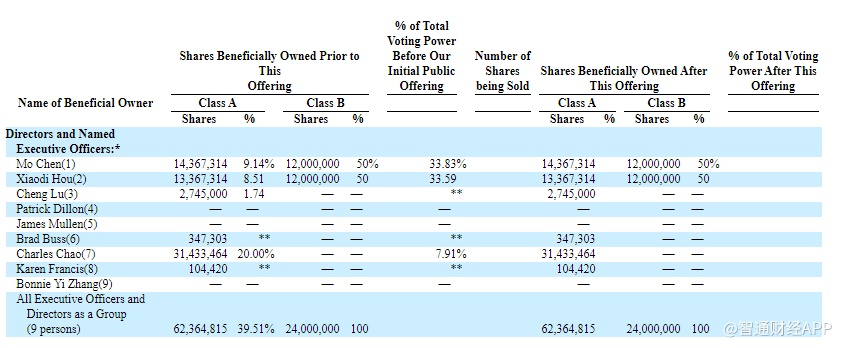 截止至2021年3月15日,公司执行主席Mo Chen持有公司14,367,314股A类普通股和1200万股B类普通股(A类普通股每股拥有1票投票权,B类普通股每股拥有10票投票权)。公司CTO Xiaodi Hou持有公司13,367,314股A类普通股和1200万股B类普通股。