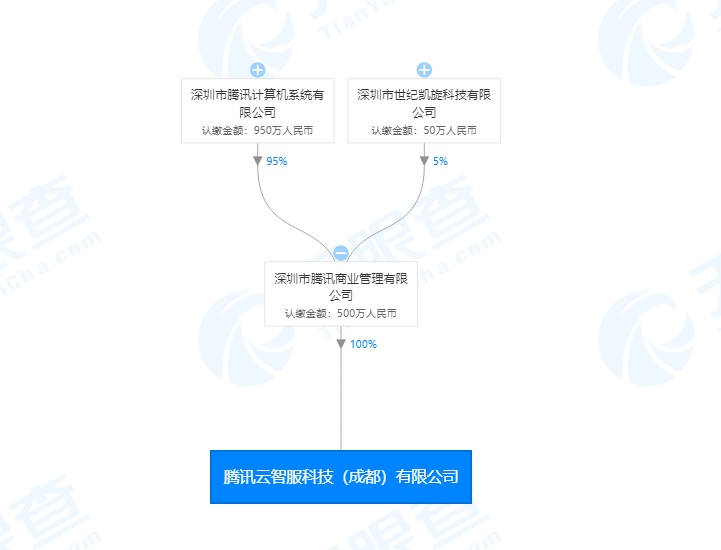 智通财经APP获悉,天眼查App显示,3月23日,腾讯云智服科技(成都)有限公司成立,该公司注册资本500万人民币,法定代表人为杨念民,经营范围含软件开发;信息技术咨询服务;人力资源服务;电子产品销售;数字内容制作服务;数字文化创意内容应用服务等。股权穿透图显示,该公司由深圳市腾讯商业管理有限公司全资控股,深圳市腾讯计算机系统有限公司间接持股95%。